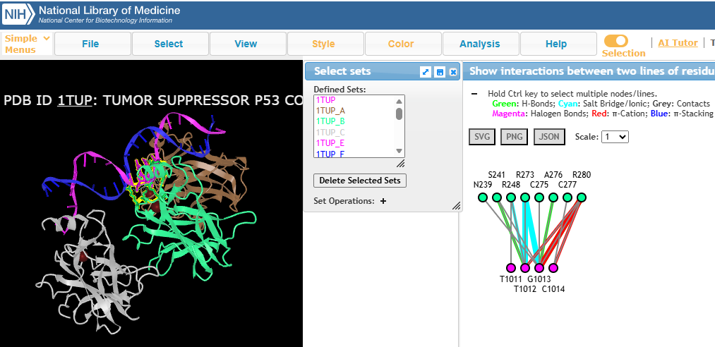 The full URL is: https://www.ncbi.nlm.nih.gov/Structure/icn3d/?mmdbafid=1TUP&command=select+sets+1TUP_B,1TUP_E;+line+graph+interaction+pairs+|+1TUP_B+1TUP_E